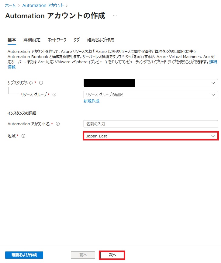 リソースグループやリソース名は任意のものを設定し[次へ]をクリック。