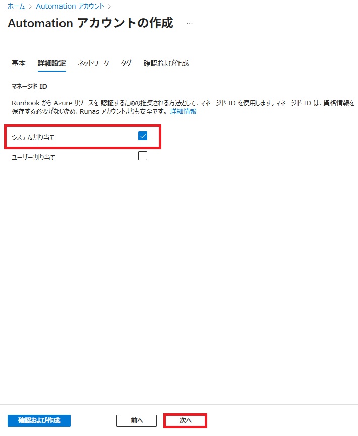 [マネージドID]-[システム割り当て]にチェックを入れ、[次へ]をクリック。