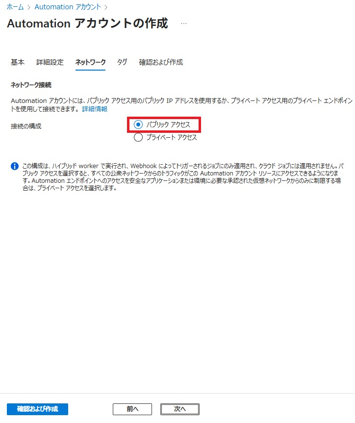 ネットワーク接続は[パブリックアクセス]を選択して[次へ]をクリック。