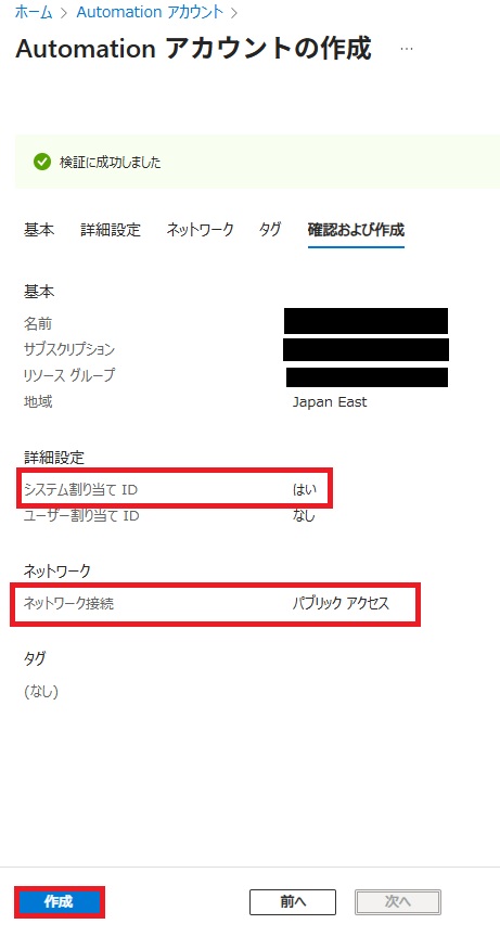 [作成]をクリックするとAutomationアカウントが作成されます。