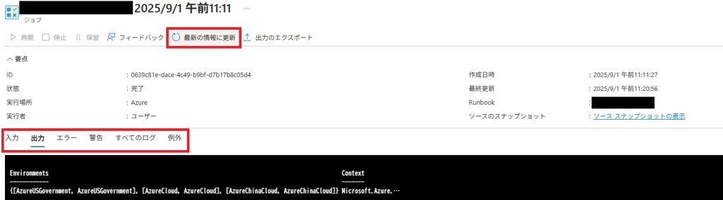 その後、対象のRunbookで[開始]をクリックすると、作成したコードが実行されます。