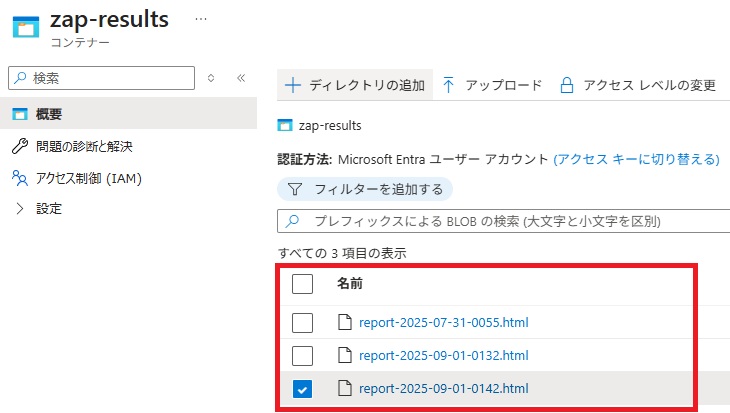 アップロードパスに指定したコンテナに診断結果ファイルがアップロードされていることを確認します。