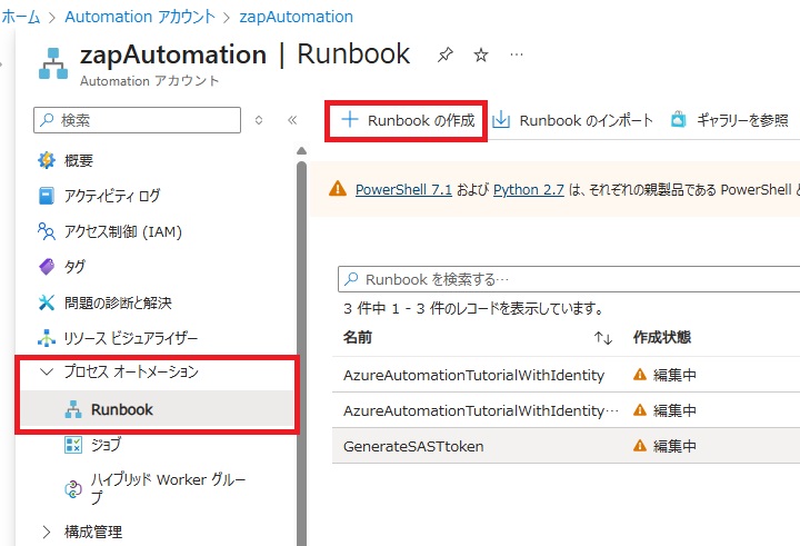この時、Runbookに[ストレージ BLOB データ共同作成者]ロールが付与されていないと作成に失敗しますので注意してください。