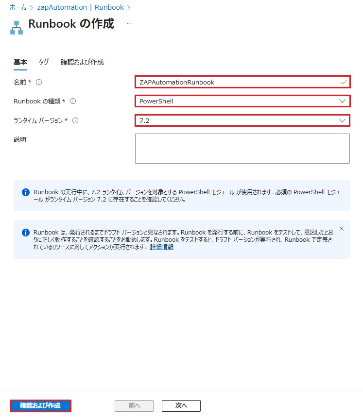 作成したAutomationアカウントの左メニュー[プロセスオートメーション] → [Runbook] → [Runbookの作成]をクリックして下記の値を設定します。