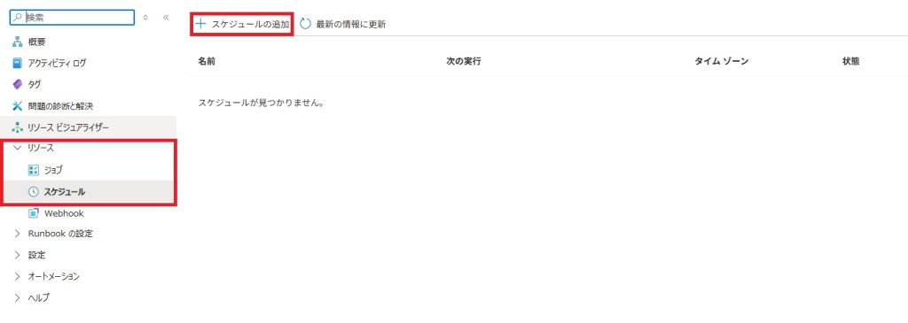 対象Runbookの左メニュー[リソース]→[スケジュール] →[スケジュールの追加]をクリックする。