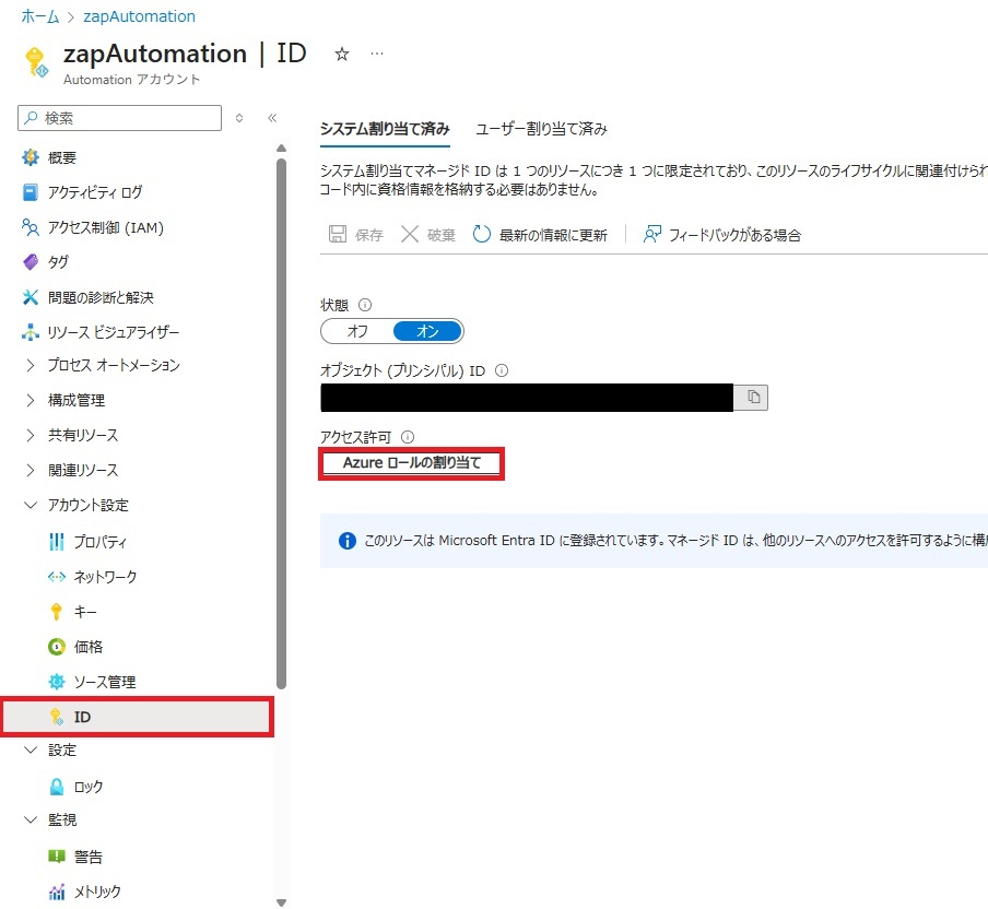 作成したAutomationアカウントの左メニュー[アカウント設定] → [ID] → [Azure ロールの割り当て]をクリック。