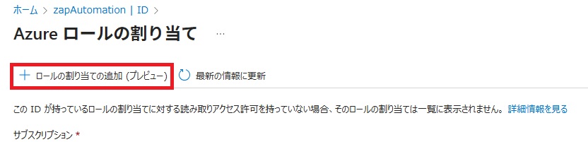 ページ上部の[ロールの割り当ての追加(プレビュー)]をクリック。