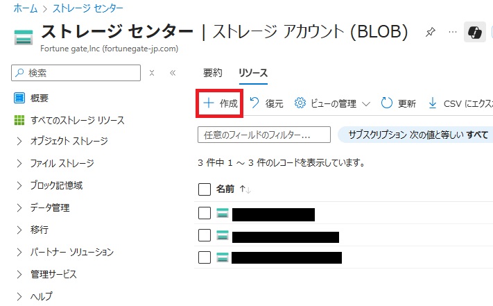 Azure portalから [ストレージアカウント]へ移動し、[作成]ボタンをクリックします。