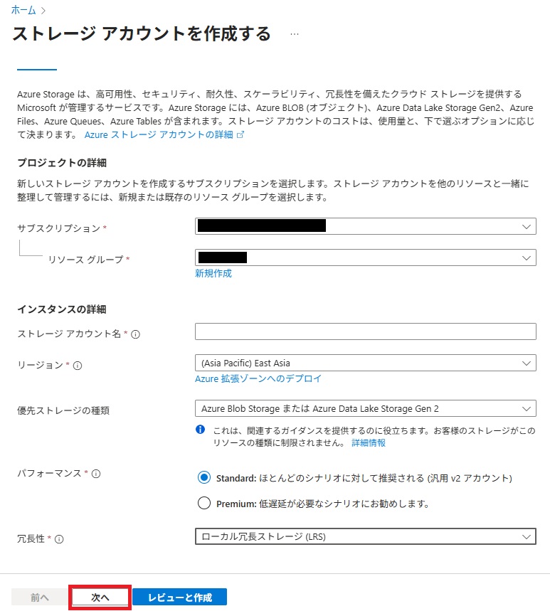サブスクリプションやリソースグループ、ストレージアカウント名に任意の値を入れ[次へ]をクリックします。