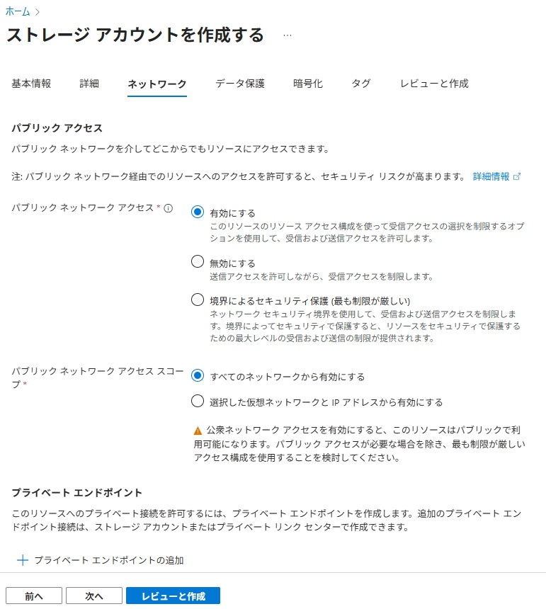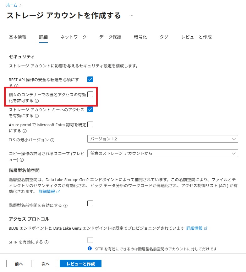 ここもデフォルトでOKですが、[個々のコンテナーでの匿名アクセスの有効化を許可する]のチェックは必ず外してください。