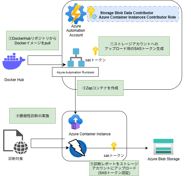 本構成では、Azure Automation Runbook(以降,Runbookと表記) をトリガーとして、Azure Container Instance(以降,ACIと表記)上で OWASP ZAP を起動し、診断結果を Azure Blob Storage に保存します。